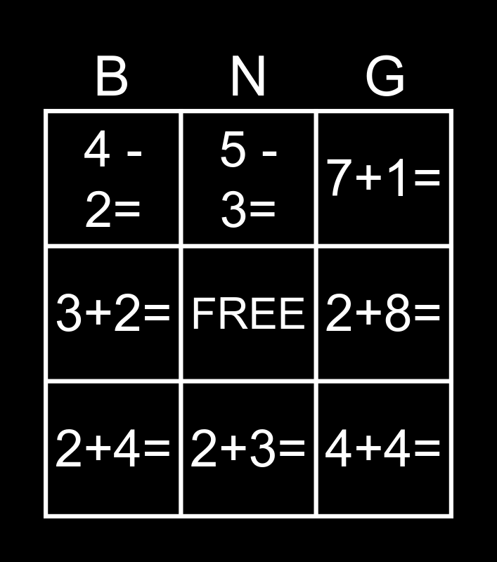 This bingo card has a free space and 11 words: 1+3=, 2+3=, 4+4=, 2+4=, 5 - 3=, 7+1=, 2+8=, 10 - 6=, 3+2=, 4 - 2= and 9 - 6=.