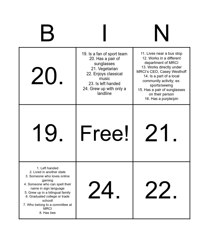 This bingo card has a free space and 9 words: 1. Left handed 2. Lived in another state 3. Someone who loves online gaming 4. Someone who can spell their name in sign language 5. Grew up in a bilingual family 6. Graduated college or trade schooll 7. Who belong to a committee at MRCI 8. Has bee, 11. Lives near a bus stop 12. Works in a different department of MRCI 13. Works directly under MRCI’s CEO, Casey Westhoff 14. Is a part of a local community activity; ex: sports/sewing 15. Has a pair of sunglasses on their person 16. Has a purple/pin, 19. Is a fan of sport team 20. Has a pair of sunglasses 21. Vegetarian 22. Enjoys classical music 23. Is left handed 24. Grew up with only a landline, 19., 20., 21., 22., 23. and 24..