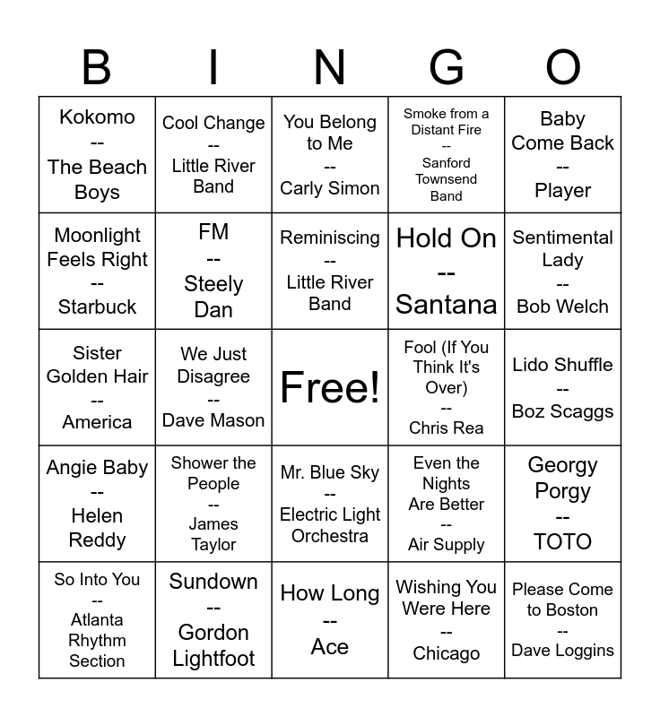 This bingo card has a free space and 65 words: You Are the Woman -- Firefall, How Much I Feel -- Ambrosia, Sara Smile -- Hall & Oates, Georgy Porgy -- TOTO, Sing a Song -- Earth, Wind & Fire, Devil Woman -- Cliff Richard, Cool Change -- Little River Band, Lady -- Little River Band, Reminiscing -- Little River Band, Key Largo -- Bertie Higgins, Mr. Blue Sky -- Electric Light Orchestra, Don't Bring Me Down -- Electric Light Orchestra, Lido Shuffle -- Boz Scaggs, Baby Come Back -- Player, Still the One -- Orleans, Moonlight Feels Right -- Starbuck, We Just Disagree -- Dave Mason, Kokomo -- The Beach Boys, Abracadabra -- Steve Miller Band, Hold On -- Santana, Shower the People -- James Taylor, Angie Baby -- Helen Reddy, Smoke from a Distant Fire -- Sanford Townsend Band, I'd Really Love to See You Tonight -- England Dan & John Ford Coley, Take it Easy -- Eagles, Witchy Woman -- Eagles, Dreams -- Fleetwood Mac, Every Time I Think of You -- The Babys, Please Come to Boston -- Dave Loggins, Cool Night -- Paul Davis, So Into You -- Atlanta Rhythm Section, Imaginary Lover -- Atlanta Rhythm Section, I Love You -- Climax Blues Band, Making Love Out of Nothing at All -- Air Supply, Even the Nights Are Better -- Air Supply, Sundown -- Gordon Lightfoot, Ventura Highway -- America, George Martin, Sister Golden Hair -- America, Wishing You Were Here -- Chicago, Thunder Island -- Jay Ferguson, FM -- Steely Dan, Magnet and Steel -- Walter Egan, Fool (If You Think It's Over) -- Chris Rea, Dream Weaver -- Gary Wright, Lotta Love -- Nicolette Larson, Biggest Part of Me -- Ambrosia, Sentimental Lady -- Bob Welch, Leather and Lace -- Stevie Nicks, Don Henley, Steal Away -- Robbie Dupree, Hold the Line -- TOTO, Summer Breeze -- Seals and Crofts, Diamond Girl -- Seals and Crofts, Brandy (You're a Fine Girl) -- Looking Glass, How Long -- Ace, Sail On -- Commodores, Crazy Love -- Poco, Sailing -- Christopher Cross, You Belong to Me -- Carly Simon, Love Will Find A Way -- Pablo Cruise, Give Me the Night -- George Benson, Just the Two of Us -- Grover Washington, Jr. and Bill Withers, Rosanna -- TOTO, I Keep Forgettin' -- Michael McDonald, Escape -- Rupert Holmes and Minute by Minute -- The Doobie Brothers.