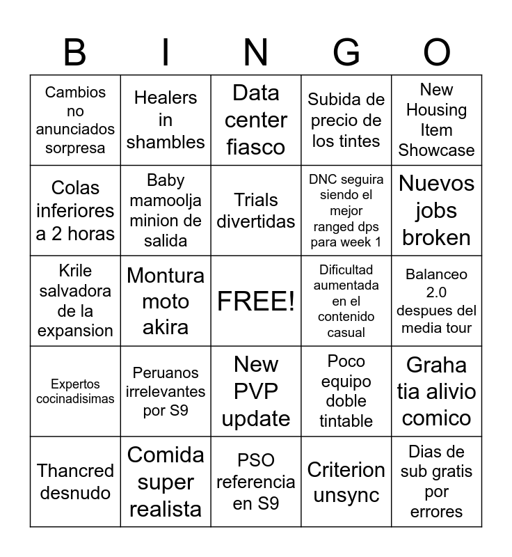 This bingo card has a free space and 27 words: Poco equipo doble tintable, Raidplan del pf ni de coña, DNC seguira siendo el mejor ranged dps para week 1, PSO referencia en S9, Colas inferiores a 2 horas, Data center fiasco, Healers in shambles, Expertos cocinadisimas, Dificultad aumentada en el contenido casual, Graha tia alivio comico, Krile salvadora de la expansion, Subida de precio de los tintes, Thancred desnudo, Comida super realista, Nuevos jobs broken, Materias ultra caras por savage, Baby mamoolja minion de salida, Trials divertidas, Peruanos irrelevantes por S9, Cambios no anunciados sorpresa, Balanceo 2.0 despues del media tour, Criterion unsync, Montura moto akira, Dias de sub gratis por errores, New PVP update, New Housing Item Showcase and New Square store merchandise previewed.