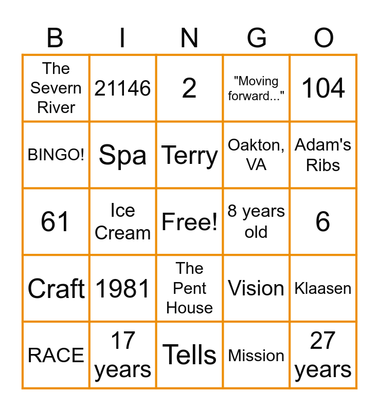 This bingo card has a free space and 24 words: 1981, 17 years, Terry, RACE, 104, The Severn River, BINGO!, 21146, 8 years old, The Pent House, Oakton, VA, 61, Vision, Klaasen, Spa, Mission, 6, 2, Adam's Ribs, Ice Cream, 27 years, Craft, "Moving forward..." and Tells.