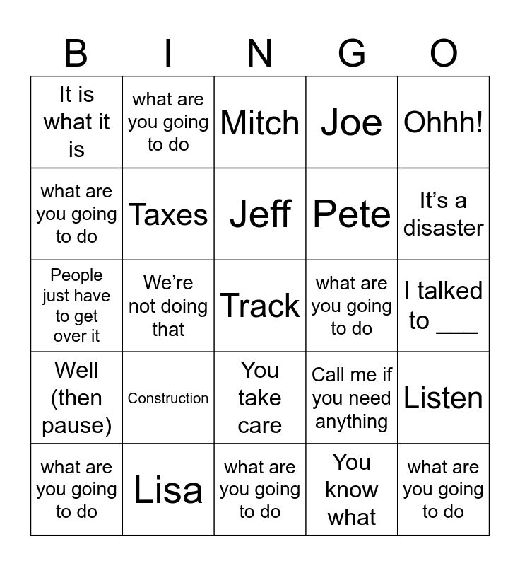 This bingo card has 29 words: what are you going to do, Yes!, Jeff, Herb, Ohhh!, It is what it is, Taxes, You take care, Call me if you need anything, Listen, People just have to get over it, We’re not doing that, Free!, You know what, It’s a disaster, People just do what they want, Construction, Track, Joe, I talked to ___, Well (then pause), Lisa, Mitch, Pete, what are you going to do, what are you going to do, what are you going to do, what are you going to do and what are you going to do.