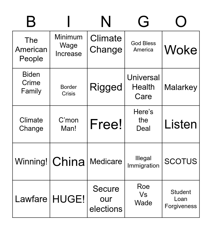This bingo card has a free space and 59 words: Fake News, HUGE!, Hunter Biden, Winning!, Roe Vs Wade, Melania, Border Crisis, Tax Cuts, Universal Health Care, Truth Social, God Bless America, Inflation, Biden Crime Family, China, Listen, The American People, Student Loan Forgiveness, Woke, January 6th, Rigged, Here’s the Deal, Climate Change, Lawfare, SCOTUS, Border Wall, Like no one has ever seen, Sad, MAGA, Malarkey, Convicted Felon, Believe Me, I’m very Smart, Witch Hunt, Tremendous, Minimum Wage Increase, “The fact is” or “the fact of the matter,, not a joke!, C’mon Man!, Scranton, Climate Change, My mother (father) had an expression…, China, Listen, Sad, Insurrection, Fraud, Malarkey, Divisive, Medicare, Secure our elections, Shrinkflation, Stop the Invasion, Lawfare, Affordable Housing, Economy, Illegal Immigration, Reproductive Rights, Gun Control and Race Theory.