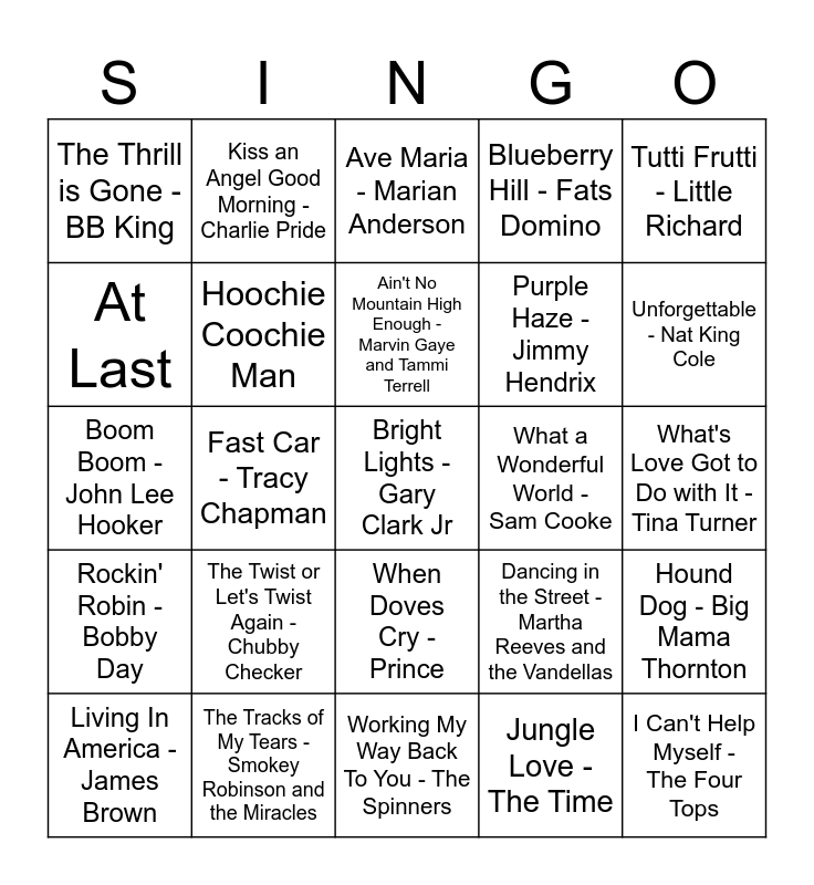 This bingo card has 63 words: Lovely Day - Bill Withers, I Will Always Love You - Whitney Houston, Glory - John Legend, Hound Dog - Big Mama Thornton, Kind Hearted Woman Blues - Robert Johnson, It's Tricky - Run DMC, Kiss an Angel Good Morning - Charlie Pride, R.E.S.P.E.C.T. - Aretha Franklin, Ain't No Mountain High Enough - Marvin Gaye and Tammi Terrell, What's Going On - Marvin Gaye, When Doves Cry - Prince, Isn't She Lovely - Stevie Wonder, What's Love Got to Do with It - Tina Turner, Tutti Frutti - Little Richard, Johnny B Goode - Chuck Berry, At Last, Fast Car - Tracy Chapman, The Thrill is Gone - BB King, Mustang Sally - Buddy Guy, Purple Haze - Jimmy Hendrix, The Twist or Let's Twist Again - Chubby Checker, Rockin' Robin - Bobby Day, Blueberry Hill - Fats Domino, Sittin On the Dock of the Bay - Otis Redding, You Send Me - Sam Cooke, My Girl - The Temptations, Night Shift - The Commodores, ABC - Jackson Five, You Keep Me Hanging On - The Supremes, Boogie Wonderland - Earth Wind and Fire, Let's Call the Whole Thing Off - Ella Fitzgerald and Louis Armstrong, I Put a Spell On You - Nina Simone, Strange Fruit - Billie Holliday, Stormy Weather - Lena Horne, Unforgettable - Nat King Cole, Living In America - James Brown, Georgia On My Mind - Ray Charles, Jungle Love - The Time, Super Freak - Rick James, Hoochie Coochie Man, Boom Boom - John Lee Hooker, What a Wonderful World - Sam Cooke, Signed Sealed Delivered - Stevie Wonder, Blinding Lights - The Weeknd, Bright Lights - Gary Clark Jr, The Tracks of My Tears - Smokey Robinson and the Miracles, I Can't Help Myself - The Four Tops, Dancing in the Street - Martha Reeves and the Vandellas, Midnight Train to Georgia - Gladys Knight and the Pips, Hello - Lionel Richie, Summer Breeze - The Isley Brothers, Working My Way Back To You - The Spinners, Hot Stuff - Donna Summer, The Blues is Alright - Little Milton, Good Morning Schoolgirl - Junior Wells, Ave Maria - Marian Anderson, Celebration - Kool and the Gang, Billie Jean - Michael Jackson, Smokestack Lightnin' - Howlin' Wolf, No Parking (On the Dance Floor) - Midnight Star, Funkytown - Lipps Inc., Reunited - Peaches and Herb and Halo - Beyonce.