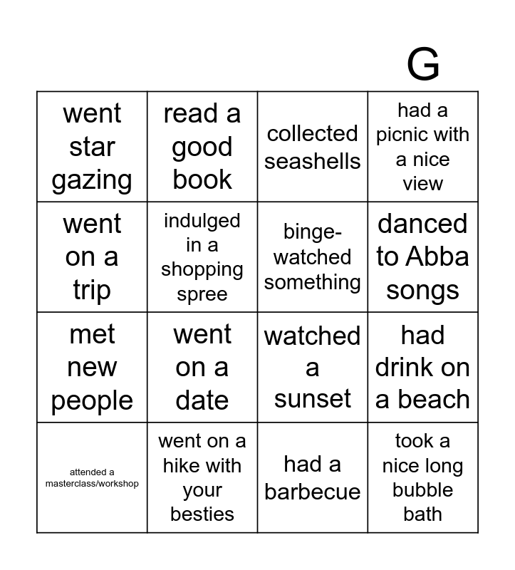 This bingo card has 16 words: went on a hike with your besties, had drink on a beach, collected seashells, went star gazing, met new people, read a good book, watched a sunset, had a barbecue, went on a trip, indulged in a shopping spree, attended a masterclass/workshop, had a picnic with a nice view, went on a date, danced to Abba songs, binge-watched something and took a nice long bubble bath.