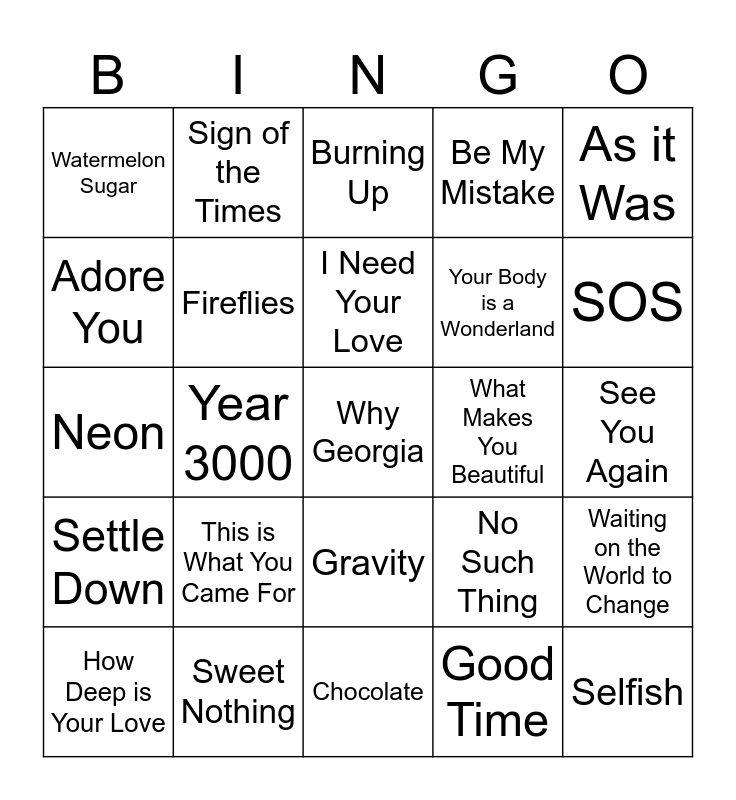 This bingo card has a free space and 24 words: This is What You Came For, Sweet Nothing, I Need Your Love, How Deep is Your Love, As it Was, Watermelon Sugar, Adore You, Sign of the Times, What Makes You Beautiful, Gravity, Your Body is a Wonderland, Neon, No Such Thing, Waiting on the World to Change, Fireflies, Good Time, See You Again, Burning Up, SOS, Year 3000, Selfish, Settle Down, Be My Mistake and Chocolate.