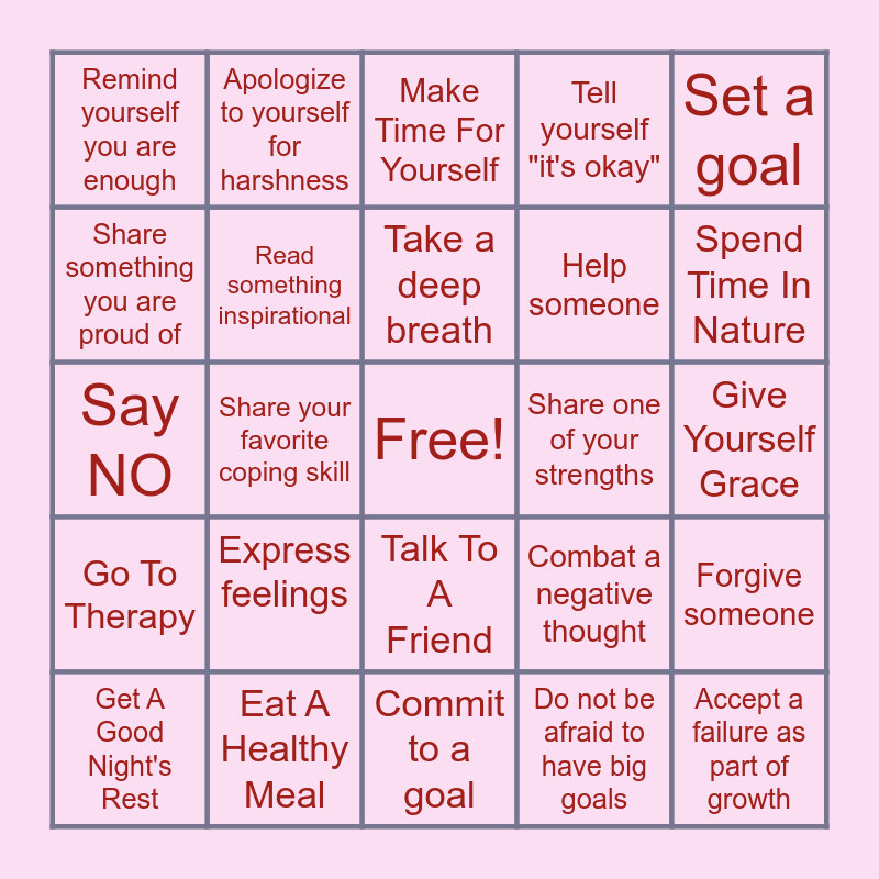 This bingo card has a free space and 49 words: Ask for help, Accept a failure as part of growth, Forgive yourself, Commit to a goal, Express feelings, Remember to reward yourself, Apologize to yourself for harshness, Share how you pamper yourself, Share something you are proud of, Be kind to yourself, Read something inspirational, Tell yourself "it's okay", Forgive someone, Combat a negative thought, Challenge limiting beliefs, Give yourself a compliment, Take a deep breath, Share one of your strengths, Identify a new skill or hobby to try, Set a goal, Share your favorite coping skill, Do not be afraid to have big goals, Remind yourself you are enough, Help someone, Read A Book, Spend Time In Nature, Get A Good Night's Rest, Walk Outside, Talk To A Friend, Go To Therapy, Act According To Your Values, Butterfly Hug, Laugh, Listen To Your Favorite Song, Eat A Healthy Meal, You Are Loveable, Set Boundaries, You Are Worthy Of Compassion, Give Yourself Grace, Mistakes Help Us Learn and Grow, Buy Yourself Flowers, Take A Bubble Bath, Take A Deep Breathe, Identify Your Needs And Wants, Say NO, Make Time For Yourself, Treat Yourself With Kindness, You Are Unique and Trust Your Gut.