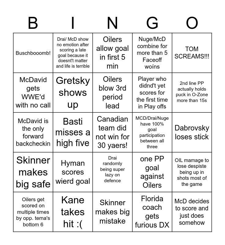 This bingo card has 25 words: Hyman scores wierd goal, Skinner makes big mistake, Oilers blow 3rd period lead, Oilers get scored on multiple times by opp. tema's bottom 6, TOM SCREAMS!!!, Buschbooomb!, McDavid gets WWE'd with no call, Drai/ McD show no emotion after scoring a late goal because it doesnt't matter and life is terrible, MCD/Drai/Nuge have 100% goal participation between all three, Drai randomly being super lazy on defence, Player who didnd't yet scores for the first time in Play offs, McDavid is the only forward backcheckin, one PP goal against Oilers, OIL mamage to lose despiste being up in shots most of the game, Gretsky shows up, McD decides to score and just does somehow, Dabrovsky loses stick, Oilers allow goal in first 5 min, 2nd line PP actually holds puck in O-Zone more than 15s, Basti misses a high five, Canadian team did not win for 30 yaers!, Kane takes hit :(, Skinner makes big safe, Nuge/McD combine for more than 5 Faceoff woíns and Florida coach gets furious DX.