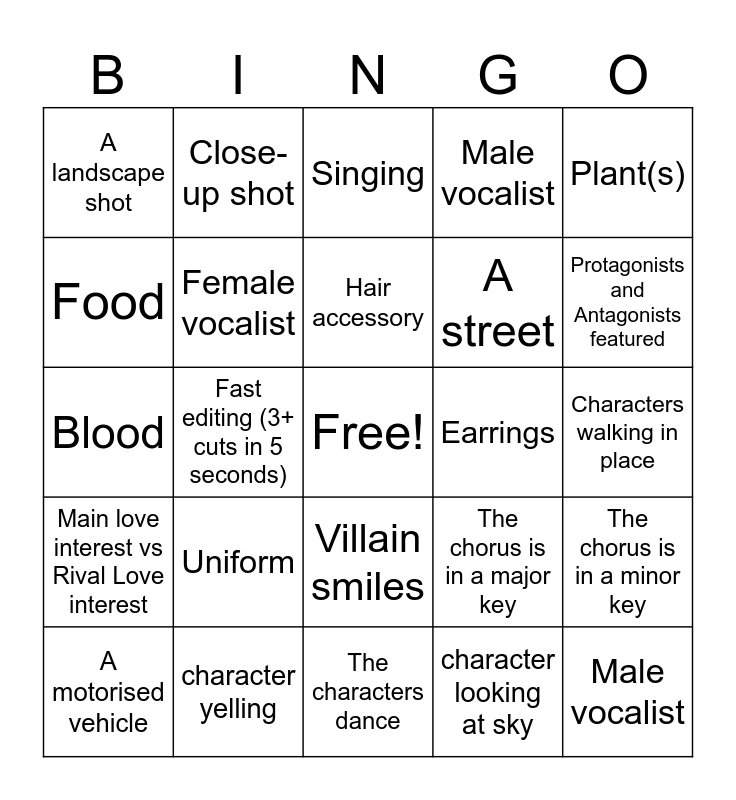 This bingo card has a free space and 51 words: Female vocalist, Male vocalist, Fast cuts, The characters dance, Uniform, ⁸, Close-up shot, Features the main character, Food, A character drinks something, Female vocalist, Male vocalist, The chorus is in a minor key, The chorus is in a major key, Fire, Uniform, Hair accessory, Earrings, No vegetation (no plants, etc), Plant(s), Fast editing (3+ cuts in 5 seconds), character looking at sky, A landscape shot, A street, Action scene during main chorus (song peak), Combat, Protagonists and Antagonists featured, character(s) running, A motorised vehicle, Singing, Technology (phone, pc, etc), Transformation, Indoors shot, Still frame/static shot, Turning head, character yelling, Flowers/petals, Hand holding, Explosion(s), Sunset, Characters walking in place, Main love interest vs Rival Love interest, The characters dance to the music, There is/are animal(s), The characters are flying/falling, There is an ocean/water, Blood, Rain, Clouds, Villain smiles and Character is playing music (eg. playing piano, guitar).