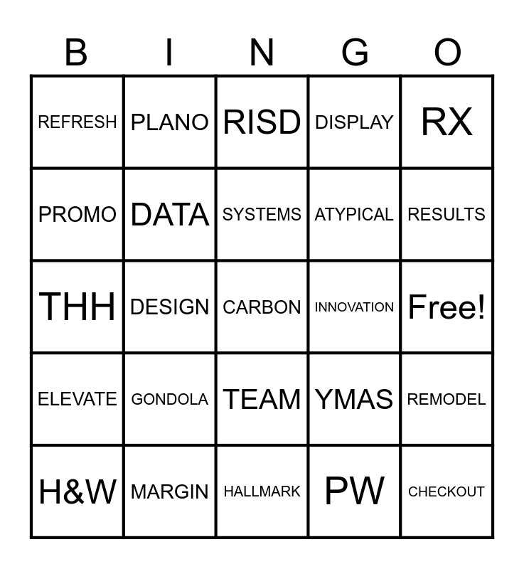 This bingo card has 66 words: LAYOUT, MERCH, STRATEGY, REMODEL, FORMAT, STORE, PLANO, RETAIL, SYSTEMS, SALES, TEAM, ENDCAP, Free!, RX, FIXTURE, PROMO, DESIGN, REFRESH, VERSION, ATYPICAL, GONDOLA, ELEVATE, DISPLAY, SEASONAL, PROJECT, VISUAL, CATEGORY, CUBBY, CARBON, SEEDLING, H&W, CVS, SIGN, HUB, YMAS, MARGIN, PILOT, THH, PW, SKU, DATA, SPACE, INNOVATION, OTCHS, TEST, VALUE, RESULTS, GRAPHIC, CHECKOUT, ASSORTMENT, HEALTH, CLINIC, HEART, COLLEAGUE, SUCCESS, LEADER, CAREER, DASHBOARD, RISD, HALLMARK, NAVARRO, GOAL, EMAIL, CUSTOMER, VACATION and BEACON.