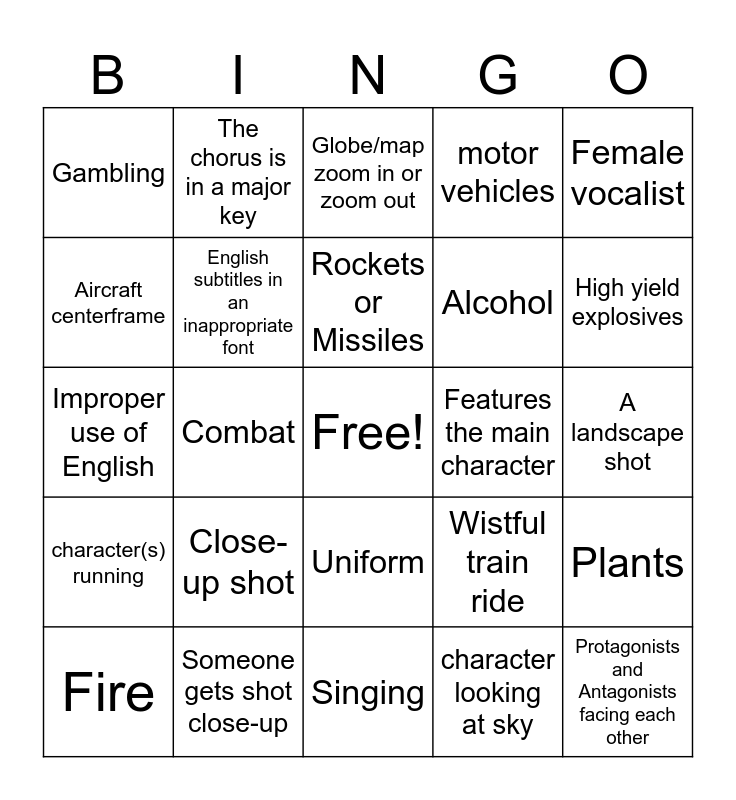 This bingo card has a free space and 24 words: Close-up shot, Someone gets shot close-up, Rockets or Missiles, Fire, Female vocalist, Gambling, Aircraft centerframe, The chorus is in a major key, Features the main character, Uniform, Alcohol, Improper use of English, Wistful train ride, Plants, English subtitles in an inappropriate font, character looking at sky, A landscape shot, Globe/map zoom in or zoom out, High yield explosives, Combat, Protagonists and Antagonists facing each other, character(s) running, motor vehicles and Singing.