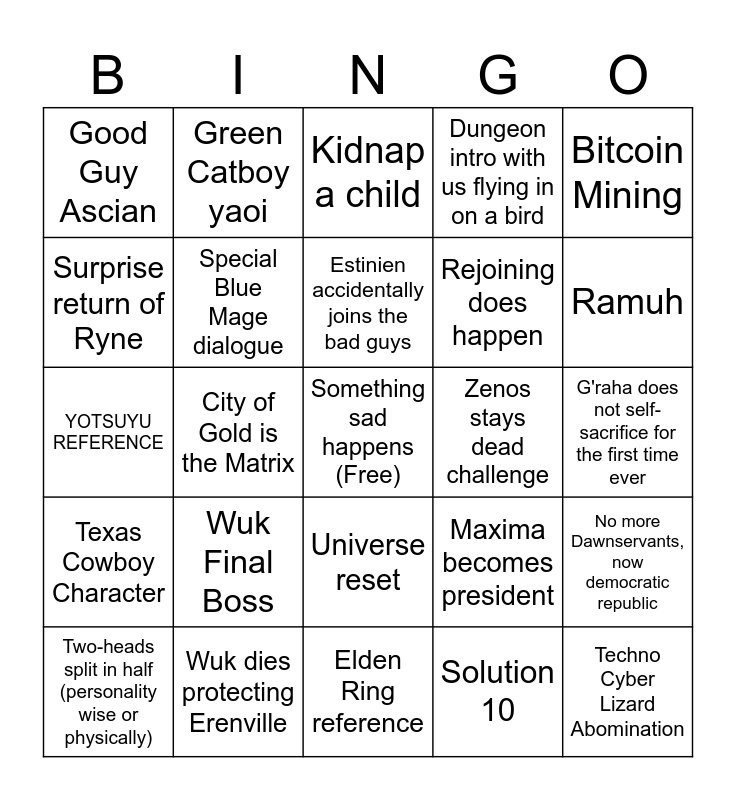 This bingo card has a free space and 24 words: Wuk Final Boss, Wuk dies protecting Erenville, Estinien accidentally joins the bad guys, Two-heads split in half (personality wise or physically), Bitcoin Mining, Good Guy Ascian, Surprise return of Ryne, Green Catboy yaoi, Zenos stays dead challenge, Universe reset, Rejoining does happen, YOTSUYU REFERENCE, Maxima becomes president, No more Dawnservants, now democratic republic, Special Blue Mage dialogue, Solution 10, G'raha does not self-sacrifice for the first time ever, Kidnap a child, Ramuh, City of Gold is the Matrix, Techno Cyber Lizard Abomination, Texas Cowboy Character, Dungeon intro with us flying in on a bird and Elden Ring reference.