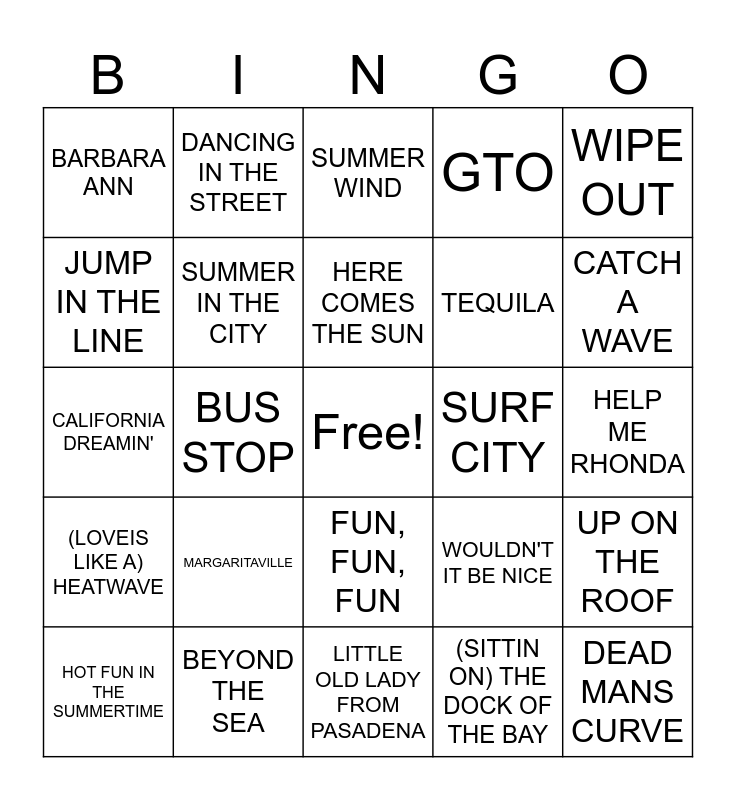 This bingo card has a free space and 34 words: UNDER THE BOARDWALK, (SITTIN ON) THE DOCK OF THE BAY, SURFIN USA, LET'S TWIST AGAIN, (LOVEIS LIKE A) HEATWAVE, SUMMER IN THE CITY, WIPE OUT, HOT FUN IN THE SUMMERTIME, DANCING IN THE STREET, GOOD VIBRATIONS, HERE COMES THE SUN, SUMMER WIND, CALIFORNIA GIRLS, ITSY BITSY TEENIE WEENIE YELLOW POLKADOT BIKINI, SURF CITY, CATCH A WAVE, BEYOND THE SEA, CALIFORNIA DREAMIN', MARGARITAVILLE, WOULDN'T IT BE NICE, FUN, FUN, FUN, LITTLE DUECE COUP, BARBARA ANN, HELP ME RHONDA, LITTLE OLD LADY FROM PASADENA, DEAD MANS CURVE, GTO, 409, TEQUILA, JUMP IN THE LINE, WINDY, BUS STOP, UP ON THE ROOF and GROOVIN.