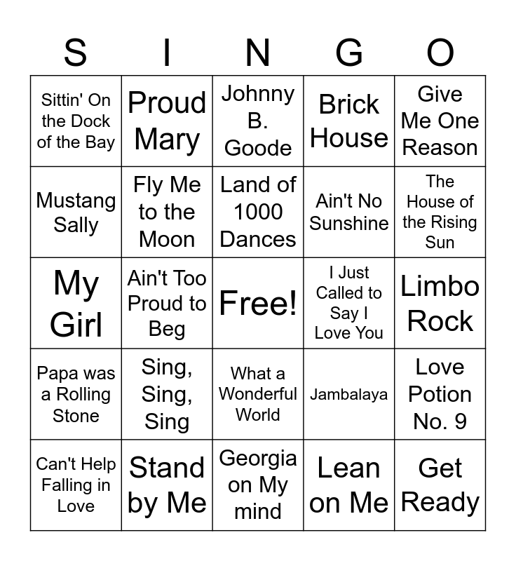 This bingo card has a free space and 55 words: Hound Dog, Can't Help Falling in Love, Get Down Tonight, Sittin' On the Dock of the Bay, Georgia on My mind, Beat it, Fly Me to the Moon, At Last, Ain't No Sunshine, Hello,Dolly, Brick House, Folsom Prison Blues, I Got You, I Feel Good, Can't Get Enough of Your Love, Babe, Another Saturday Night, Celebrate Good Time, Give Me One Reason, Ain't Too Proud to Beg, ABC, Get Ready, I Just Called to Say I Love You, I Walk the Line, Jambalaya, Johnny B. Goode, Kung Fu Fighting, Land of 1000 Dances, Lean on Me, Let's Stay Together, Limbo Rock, Love Potion No. 9, Love Shack, Low Rider, Man in the Mirror, Midnight Train to Georgia, Mustang Sally, My Girl, Only You, Papa was a Rolling Stone, Patches, Play that Funky Music White Boy, Proud Mary, Respect, Return to Sender, Ring of Fire, Sing, Sing, Sing, Stand by Me, Superstition, Sweet Home Alabama, Swinging on a Star, The House of the Rising Sun, The Thrill is Gone, Under the Boardwalk, Walkin' After Midnight, What a Wonderful World and Billie Jean.