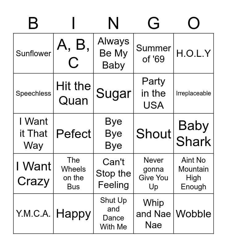 This bingo card has a free space and 24 words: The Wheels on the Bus, Happy, Sugar, Y.M.C.A., H.O.L.Y, Sunflower, Speechless, A, B, C, Shout, Can't Stop the Feeling, Party in the USA, I Want it That Way, Never gonna Give You Up, Aint No Mountain High Enough, Hit the Quan, Whip and Nae Nae, Baby Shark, Always Be My Baby, Irreplaceable, Pefect, Wobble, I Want Crazy, Summer of '69 and Shut Up and Dance With Me.