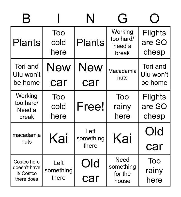 This bingo card has a free space and 25 words: Kai, Old car, New car, Costco here doesn’t have it/ Costco there does, Flights are SO cheap, Plants, Tori and Ulu won’t be home, Too cold here, Too rainy here, Left something there, Macadamia nuts, Working too hard/ Need a break, Kai, Old car, New car, Costco here doesn’t have it/ Costco there does, Flights are SO cheap, Plants, Tori and Ulu won’t be home, Too cold here, Too rainy here, Left something there, macadamia nuts, Working too hard/ need a break and Need something for the house.