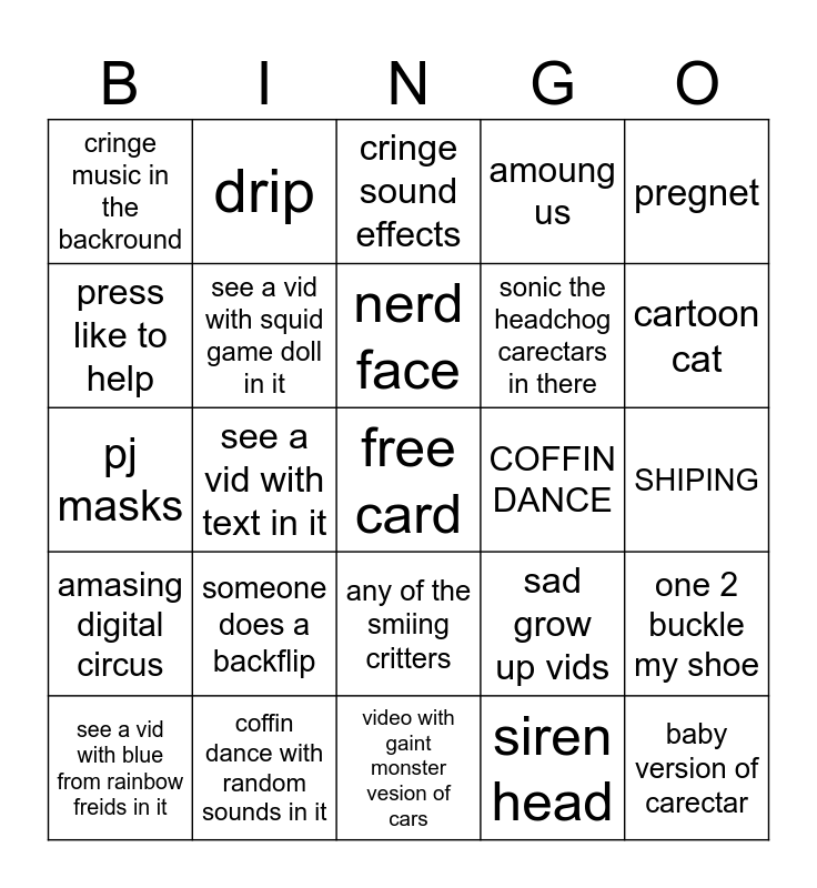 This bingo card has a free space and 29 words: see a vid with blue from rainbow freids in it, see a vid with huggy wuggy in it, see a vid with text in it, see a vid with any sort of brainrot in it, cringe music in the backround, cringe sound effects, see a vid with squid game doll in it, someone does a backflip, COFFIN DANCE, coffin dance with random sounds in it, SHIPING, baby version of carectar, video with gaint monster vesion of cars, siren head, cartoon cat, slipping on a banana, any of the smiing critters, amasing digital circus, pregnet, pj masks, sad grow up vids, the vid where the cars go through the hammers and crushers, sonic the headchog carectars in there, press like to help, amoung us, drip, one 2 buckle my shoe, nerd face and crying.