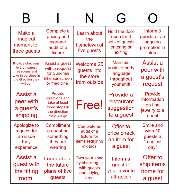 This bingo card has a free space and 39 words: Sell 5 reusable bags, Use Merch Search to find an item for a guest, Call another location to confirm an item is available for a guest, Assist a guest with a request for Sundries (like sunscreen or medicine), Assist a guest with the fitting room., Complete an audit of a fixture for items requiring ink tags, Welcome 25 guests into the store from outside, Greet & engage 25 guests in your zone from other zones, Inform 3 guests of an ongoing promotion in store, Apologize to a guest for an issue they experience, Provide directions and take at least three steps in the direction they will go, Hold the door open for 3 sets of guests entering or exiting, Offer to ship items home for a guest, Provide information on fine jewelry to a guest, Provide a restaurant suggestion to a guest, Compliment a guest on something they are wearing, Share a fond Disney memory with a guest, Make a magical moment for three guests, Pin trade with ten guests, Offer to price check an item for a guest, Provide directions to the nearest restrooms and take three steps in the direction they will go., Own your zone by checking in with guests and tidying area, Maintain positive body language throughout your shift, Assist a peer with a guest's request, Use Smart Stock to check our stockroom for a size, Check the stockroom for an item for a guest, Offer to place an item on hold for a guest, Recognize five guests for the celebration buttons they are wearing, Assist a guest with a Dooney Bag, Complete a pricing and signage audit of a fixture, Ensure 5 arms of clothing are faced out with the largest logo, Size 5 racks of clothing, Learn about the hometown of five guests, Learn about the future plans of five guests, Inform a guest of your favorite attraction, Share with guests a good viewing spot for fireworks, Smile and wish 10 guests a "magical day", Assist a peer with a guest's shipping and Assist a guest with information for transportation options.