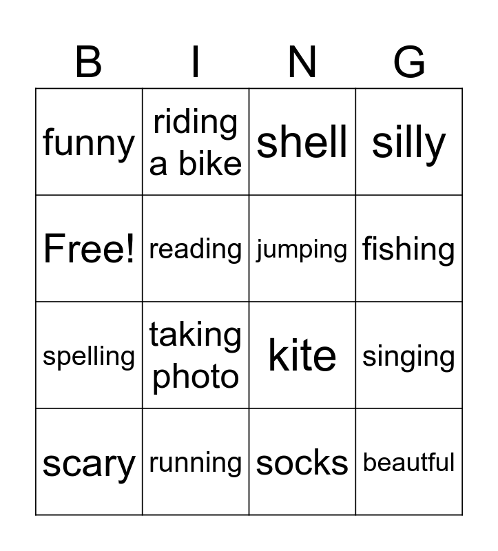 This bingo card has 16 words: running, singing, shell, funny, spelling, riding a bike, kite, socks, Free!, reading, scary, silly, taking photo, fishing, jumping and beautful.