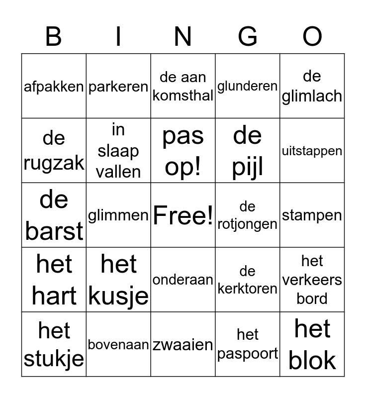 This bingo card has a free space and 40 words: de aanrijding, de barst, de halte, in slaap vallen, bovenaan, onderaan, pas op!, stampvol, de glimlach, het hart, glimmen, glunderen, het blok, stampen, de rotjongen, het kusje, de slappe lach, afpakken, troosten, de aan komsthal, het verkeers bord, het paspoort, de pijl, de rugzak, het stukje, het vliegveld, de vertrekhal, de brommer, de camping, de garage, de hijskraan, het stukje, de kerk, de kerktoren, uitstappen, zwaaien, sip, omhelzen, parkeren and kaal.