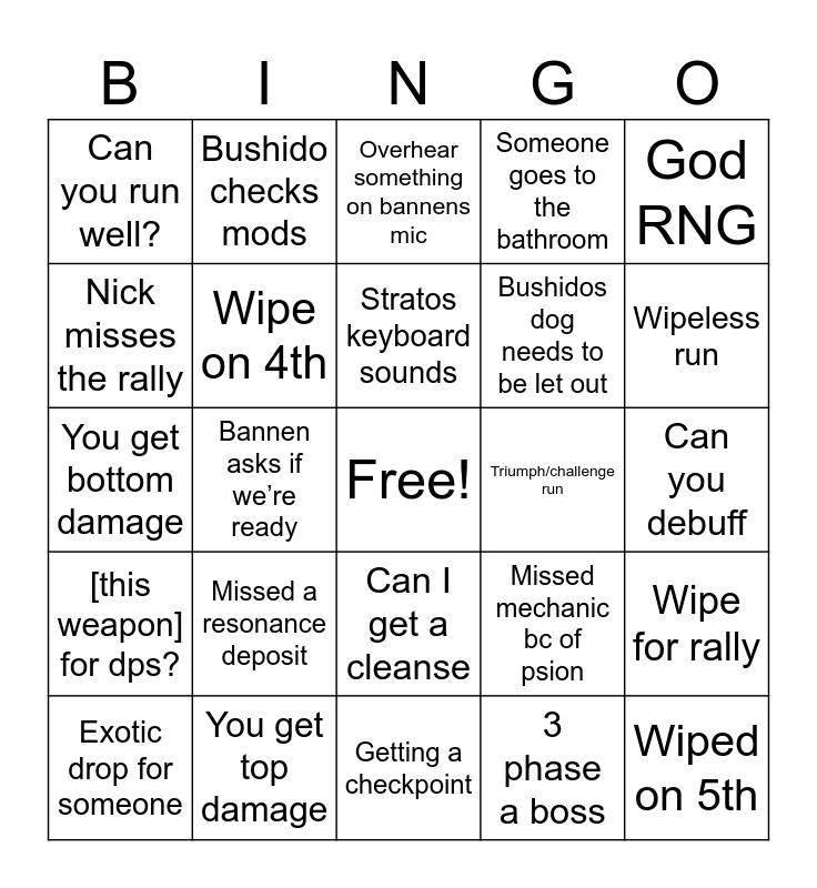 This bingo card has a free space and 33 words: Bushido needs special/aeons/heavy, Hoot adjusts mods, Bannen asks if we’re ready, Syn dies jumping early, [this weapon] for dps?, Wipe on 4th, God RNG, Exotic drop for someone, Bushido checks mods, Someone missed a conductor, Stratos keyboard sounds, Overhear something on bannens mic, Sub 2 hour run, Red chest run, Triumph/challenge run, Wipeless run, You get top damage, You get bottom damage, Missed a resonance deposit, Missed mechanic bc of psion, Can I get a cleanse, Not enough hunters, Can you run well?, Can you debuff, Getting a checkpoint, Wiped on 5th, Someone goes to the bathroom, Bushidos dog needs to be let out, Nick misses the rally, Wipe for rally, Wipe to running out of time, 3 phase a boss and Wipe for damage.