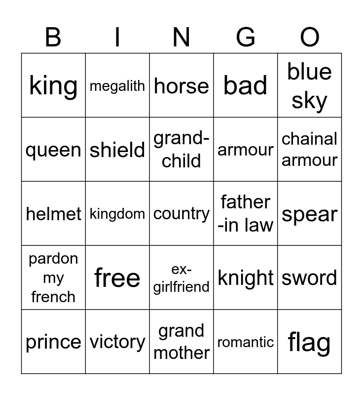 This bingo card has 25 words: free, grand mother, grand-child, prince, blue sky, king, queen, megalith, father -in law, ex-girlfriend, armour, helmet, knight, sword, shield, flag, spear, horse, chainal armour, kingdom, country, victory, pardon my french, bad and romantic.
