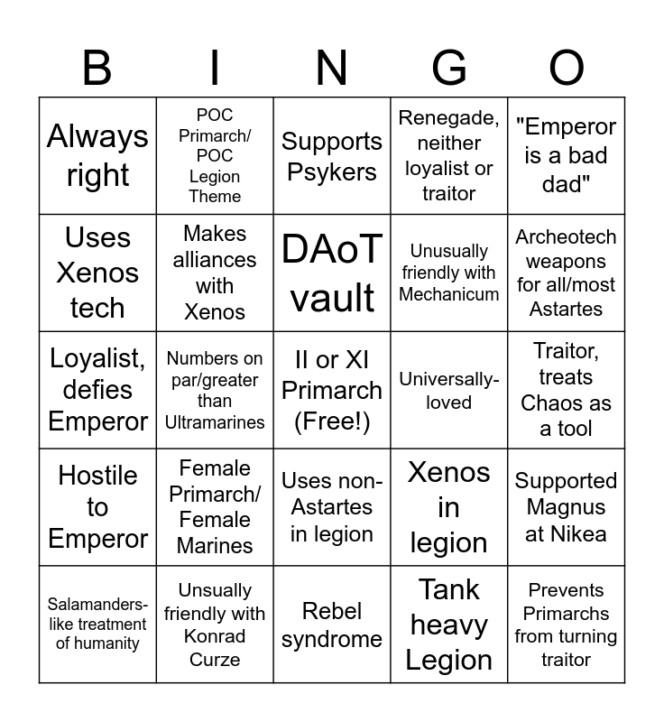 This bingo card has a free space and 24 words: Female Primarch/ Female Marines, Unsually friendly with Konrad Curze, DAoT vault, Salamanders-like treatment of humanity, "Emperor is a bad dad", Always right, Uses Xenos tech, POC Primarch/ POC Legion Theme, Universally-loved, Uses non-Astartes in legion, Unusually friendly with Mechanicum, Loyalist, defies Emperor, Xenos in legion, Supported Magnus at Nikea, Makes alliances with Xenos, Tank heavy Legion, Traitor, treats Chaos as a tool, Supports Psykers, Archeotech weapons for all/most Astartes, Numbers on par/greater than Ultramarines, Prevents Primarchs from turning traitor, Hostile to Emperor, Renegade, neither loyalist or traitor and Rebel syndrome.