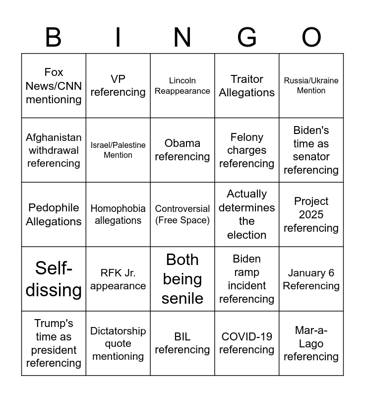 This bingo card has a free space and 24 words: RFK Jr. appearance, Dictatorship quote mentioning, Obama referencing, Trump's time as president referencing, Russia/Ukraine Mention, Fox News/CNN mentioning, Afghanistan withdrawal referencing, VP referencing, Actually determines the election, Both being senile, Felony charges referencing, Pedophile Allegations, Biden ramp incident referencing, January 6 Referencing, Israel/Palestine Mention, COVID-19 referencing, Project 2025 referencing, Lincoln Reappearance, Biden's time as senator referencing, Homophobia allegations, Mar-a-Lago referencing, Self-dissing, Traitor Allegations and BIL referencing.