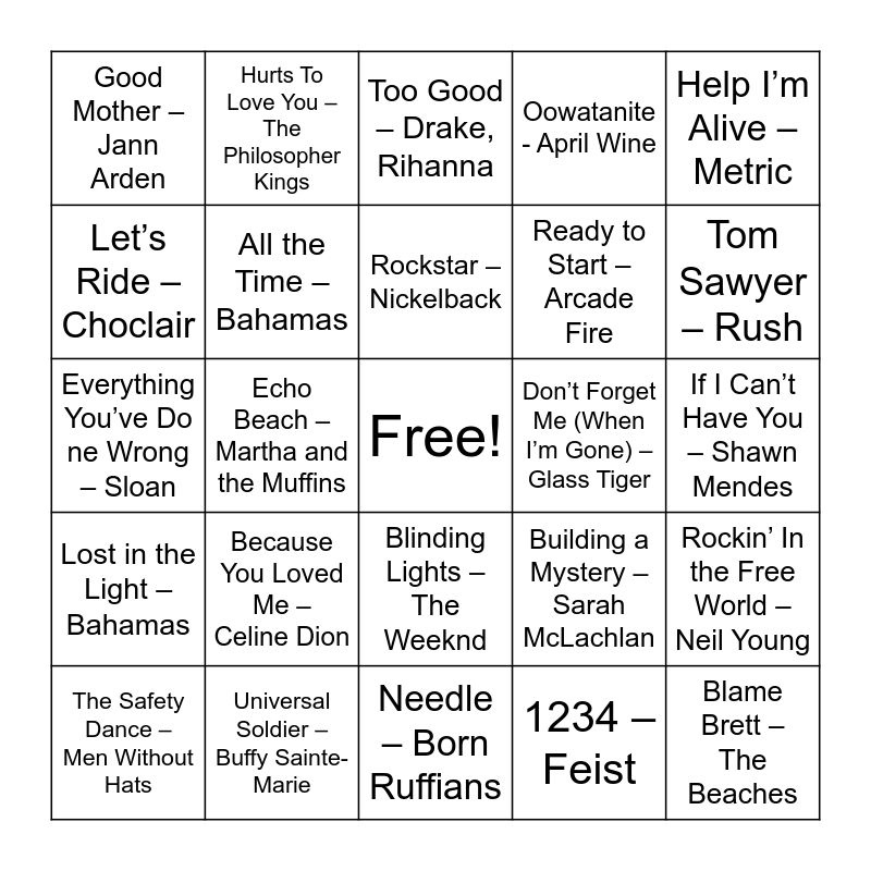 This bingo card has a free space and 42 words: Superman’s Song – Crash Test Dummies, Rockstar – Nickelback, It’s All Coming Back to Me Now – Celine Dion, Because You Loved Me – Celine Dion, 1234 – Feist, Rockin’ In the Free World – Neil Young, Blame Brett – The Beaches, Closer – Tegan and Sara, Too Good – Drake, Rihanna, Blinding Lights – The Weeknd, If I Can’t Have You – Shawn Mendes, Tom Sawyer – Rush, Echo Beach – Martha and the Muffins, Help I’m Alive – Metric, I Love Myself Today – Bif Naked, Building a Mystery – Sarah McLachlan, The Good in Everyone – Sloan, Everything You’ve Done Wrong – Sloan, She’s So High – Tal Bachman, Hurts To Love You – The Philosopher Kings, Let’s Ride – Choclair, Constant Craving – k.d. lang, Before You – Chantal Kreviazuk, Good Mother – Jann Arden, I’ve Been Everywhere – Hank Snow, Wake Up – Arcade Fire, Ready to Start – Arcade Fire, Northern Touch – Rascalz, Dangerous – Kardinal Offishall, Sunday Morning – K-OS, Leather Jacket – Arkells, Lost in the Light – Bahamas, All the Time – Bahamas, Needle – Born Ruffians, Money – The Beaches, The Safety Dance – Men Without Hats, Universal Soldier – Buffy Sainte-Marie, Don’t Forget Me (When I’m Gone) – Glass Tiger, King of Spain – Moxy Fruvous, KD and Lunch Meat – Boy Golden, Oowatanite - April Wine and Barrett's Privateers - Stan Rogers.