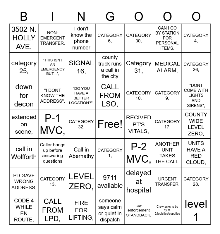 This bingo card has a free space and 49 words: URGENT TRANSFER,, MEDICAL ALARM,, law enforcement STANDBACK,, P-1 MVC,, "DO YOU HAVE A BETTER LOCATION?",, COUNTY WIDE LEVEL ZERO,, NON-EMERGENT TRANSFER,, FIRE FOR LIFTING,, CAN I GO BY STATION FOR PERSONAL ITEMS,, CATEGORY 1,, CATEGORY 4,, CATEGORY 6,, CATEGORY 9,, CATEGORY 10,, CATEGORY 13,, CATEGORY 17,, category 25,, CATEGORY 26,, CATEGORY 28,, CATEGORY 30,, Category 31,, CATEGORY 32,, 3502 N. HOLLY AVE,, "THIS ISNT AN EMERGENCY BUT...",, CODE 4 WHILE EN ROUTE,, SIGNAL 16,, "DONT COME WITH LIGHTS AND SIRENS",, CALL FROM LPD,, CALL FROM LSO,, "I DONT KNOW THE ADDRESS",, "IM A "medical professional",, RECIVED PT'S VITALS,, PD GAVE WRONG ADDRESS,, LEVEL ZERO,, extended on scene,, P-2 MVC,, ANOTHER UNIT TAKES THE CALL,, UNITS HAVE A RED CLOUD,, down for decon, Call in Abernathy, 9711 available, call in Wolfforth, level 1, someone says calm or quiet in dispatch, county truck runs a call in the city, I don't know the phone number, delayed at hospital, Caller hangs up before answering questions and Crew asks to by by st. 2/logistics/supplies.