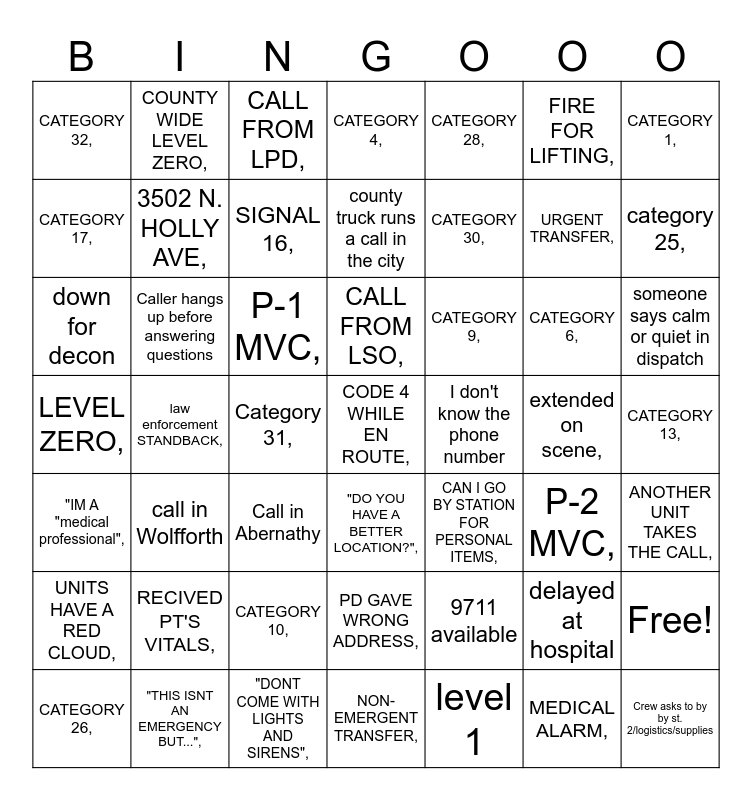 This bingo card has 50 words: Free!, URGENT TRANSFER,, MEDICAL ALARM,, law enforcement STANDBACK,, P-1 MVC,, "DO YOU HAVE A BETTER LOCATION?",, COUNTY WIDE LEVEL ZERO,, NON-EMERGENT TRANSFER,, FIRE FOR LIFTING,, CAN I GO BY STATION FOR PERSONAL ITEMS,, CATEGORY 1,, CATEGORY 4,, CATEGORY 6,, CATEGORY 9,, CATEGORY 10,, CATEGORY 13,, CATEGORY 17,, category 25,, CATEGORY 26,, CATEGORY 28,, CATEGORY 30,, Category 31,, CATEGORY 32,, 3502 N. HOLLY AVE,, "THIS ISNT AN EMERGENCY BUT...",, CODE 4 WHILE EN ROUTE,, SIGNAL 16,, "DONT COME WITH LIGHTS AND SIRENS",, CALL FROM LPD,, CALL FROM LSO,, "I DONT KNOW THE ADDRESS",, "IM A "medical professional",, RECIVED PT'S VITALS,, PD GAVE WRONG ADDRESS,, LEVEL ZERO,, extended on scene,, P-2 MVC,, ANOTHER UNIT TAKES THE CALL,, UNITS HAVE A RED CLOUD,, down for decon, Call in Abernathy, 9711 available, call in Wolfforth, level 1, someone says calm or quiet in dispatch, county truck runs a call in the city, I don't know the phone number, delayed at hospital, Caller hangs up before answering questions and Crew asks to by by st. 2/logistics/supplies.