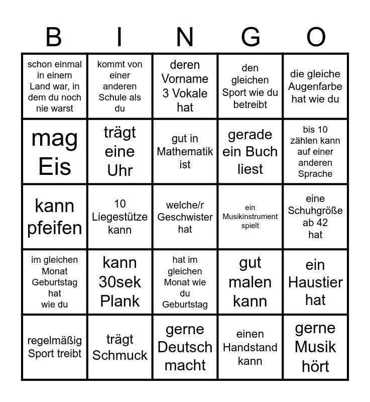 This bingo card has a free space and 24 words: kann 30sek Plank, trägt Schmuck, gut in Mathematik ist, regelmäßig Sport treibt, die gleiche Augenfarbe hat wie du, schon einmal in einem Land war, in dem du noch nie warst, mag Eis, kommt von einer anderen Schule als du, ein Musikinstrument spielt, hat im gleichen Monat wie du Geburtstag, gerade ein Buch liest, kann pfeifen, gut malen kann, ein Haustier hat, trägt eine Uhr, einen Handstand kann, eine Schuhgröße ab 42 hat, deren Vorname 3 Vokale hat, bis 10 zählen kann auf einer anderen Sprache, 10 Liegestütze kann, gerne Musik hört, im gleichen Monat Geburtstag hat wie du, den gleichen Sport wie du betreibt and gerne Deutsch macht.