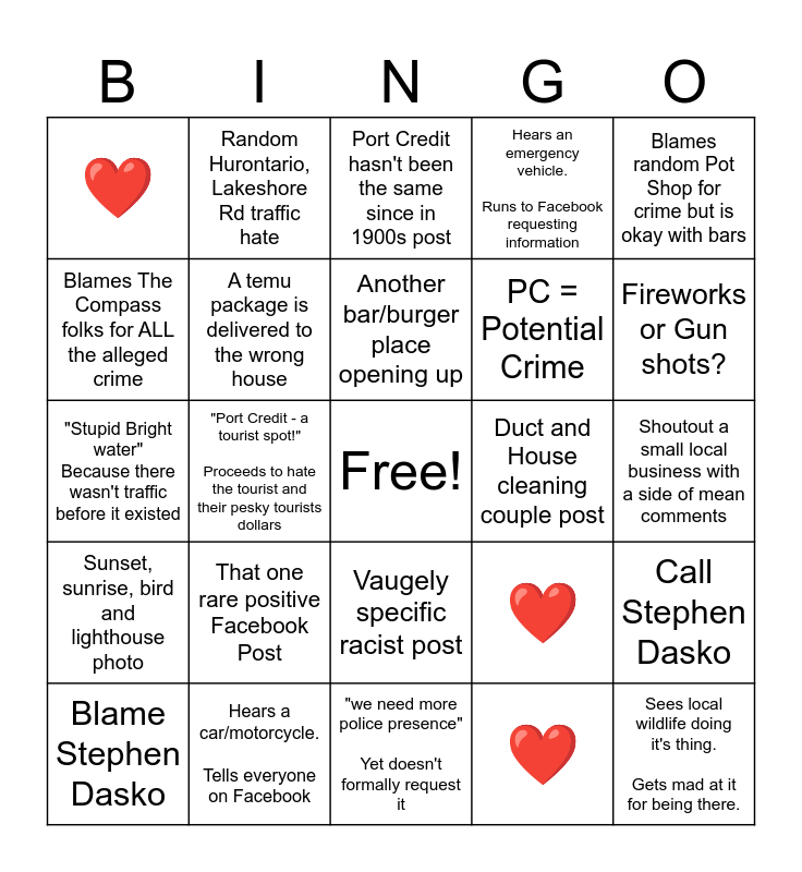 This bingo card has a free space and 24 words: Blame Stephen Dasko, That one rare positive Facebook Post, Another bar/burger place opening up, ❤️, Blames random Pot Shop for crime but is okay with bars, ❤️, Random Hurontario, Lakeshore Rd traffic hate, Port Credit hasn't been the same since in 1900s post, Duct and House cleaning couple post, Shoutout a small local business with a side of mean comments, "Stupid Bright water" Because there wasn't traffic before it existed, A temu package is delivered to the wrong house, ❤️, Call Stephen Dasko, Blames The Compass folks for ALL the alleged crime, Hears a car/motorcycle. Tells everyone on Facebook, "we need more police presence" Yet doesn't formally request it, Hears an emergency vehicle. Runs to Facebook requesting information, Fireworks or Gun shots?, Sunset, sunrise, bird and lighthouse photo, "Port Credit - a tourist spot!" Proceeds to hate the tourist and their pesky tourists dollars, Vaugely specific racist post, PC = Potential Crime and Sees local wildlife doing it's thing. Gets mad at it for being there..