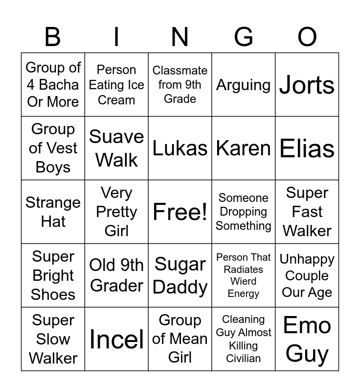 This bingo card has a free space and 24 words: Old 9th Grader, Incel, Lukas, Super Slow Walker, Jorts, Group of 4 Bacha Or More, Group of Vest Boys, Person Eating Ice Cream, Someone Dropping Something, Sugar Daddy, Karen, Strange Hat, Person That Radiates Wierd Energy, Unhappy Couple Our Age, Suave Walk, Cleaning Guy Almost Killing Civilian, Super Fast Walker, Classmate from 9th Grade, Elias, Very Pretty Girl, Emo Guy, Super Bright Shoes, Arguing and Group of Mean Girl.
