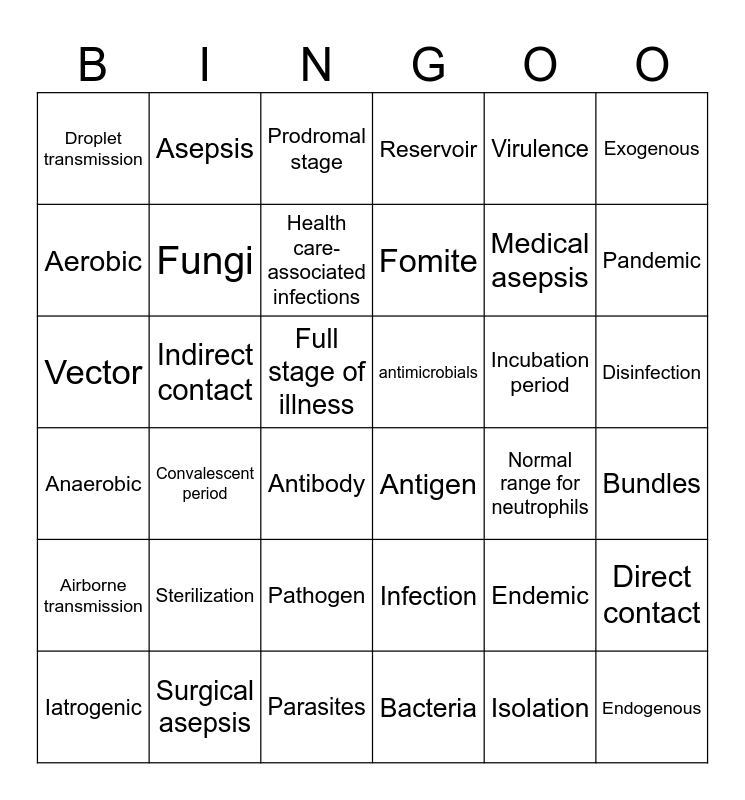 This bingo card has 36 words: Infection, Pathogen, Bacteria, Aerobic, Anaerobic, antimicrobials, Fungi, Parasites, Virulence, Endemic, Pandemic, Reservoir, Direct contact, Indirect contact, Fomite, Droplet transmission, Airborne transmission, Incubation period, Vector, Prodromal stage, Full stage of illness, Convalescent period, Antigen, Antibody, Normal range for neutrophils, Asepsis, Medical asepsis, Surgical asepsis, Health care-associated infections, Exogenous, Endogenous, Iatrogenic, Bundles, Disinfection, Sterilization and Isolation.