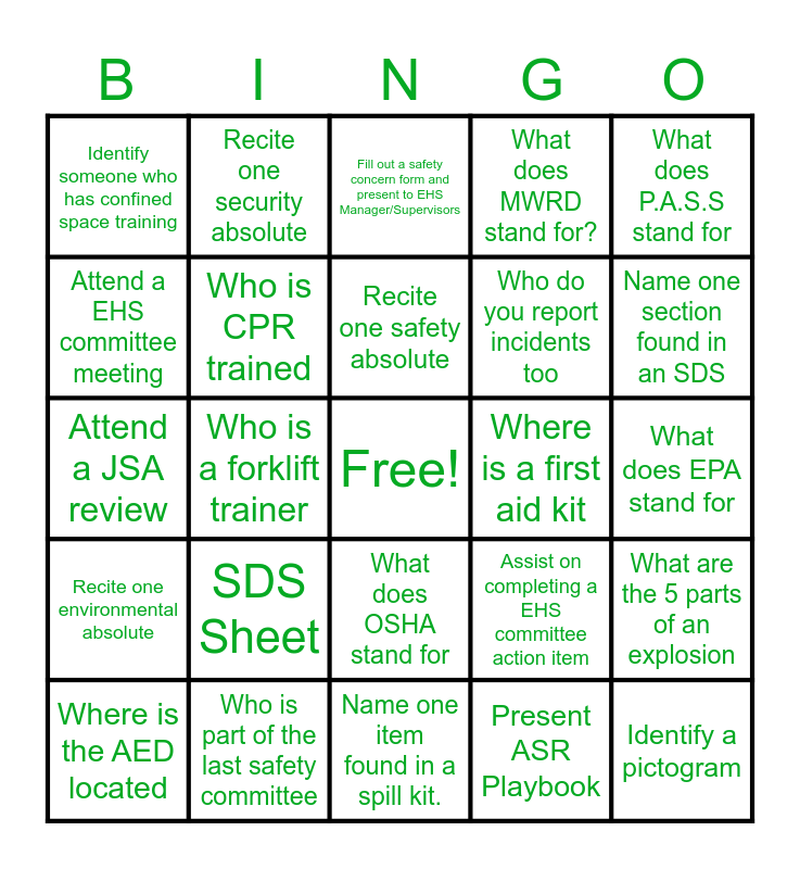 This bingo card has a free space and 24 words: SDS Sheet, Who is part of the last safety committee, Recite one safety absolute, Where is the AED located, What does P.A.S.S stand for, Identify someone who has confined space training, Attend a EHS committee meeting, Recite one security absolute, Where is a first aid kit, What does OSHA stand for, Who do you report incidents too, Attend a JSA review, Assist on completing a EHS committee action item, What are the 5 parts of an explosion, Who is CPR trained, Present ASR Playbook, What does EPA stand for, Fill out a safety concern form and present to EHS Manager/Supervisors, Name one section found in an SDS, Who is a forklift trainer, Identify a pictogram, Recite one environmental absolute, What does MWRD stand for? and Name one item found in a spill kit..