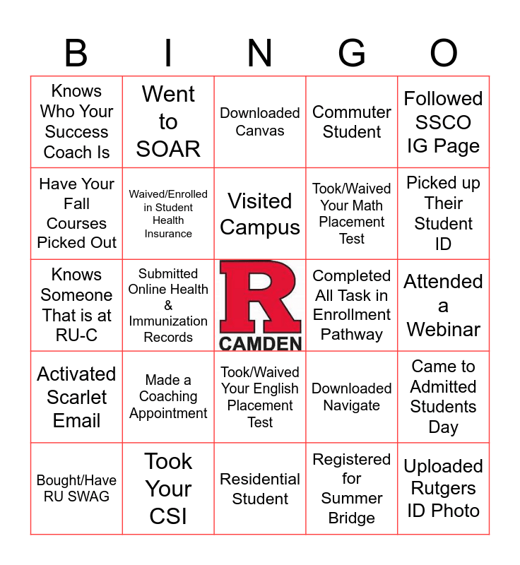 This bingo card has a free space and 24 words: Made a Coaching Appointment, Took Your CSI, Visited Campus, Bought/Have RU SWAG, Followed SSCO IG Page, Knows Who Your Success Coach Is, Have Your Fall Courses Picked Out, Went to SOAR, Completed All Task in Enrollment Pathway, Took/Waived Your English Placement Test, Took/Waived Your Math Placement Test, Knows Someone That is at RU-C, Downloaded Navigate, Came to Admitted Students Day, Waived/Enrolled in Student Health Insurance, Registered for Summer Bridge, Attended a Webinar, Downloaded Canvas, Picked up Their Student ID, Submitted Online Health & Immunization Records, Uploaded Rutgers ID Photo, Activated Scarlet Email, Commuter Student and Residential Student.