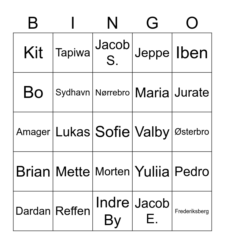 This bingo card has a free space and 24 words: Mette, Reffen, Nørrebro, Dardan, Iben, Kit, Bo, Tapiwa, Valby, Morten, Maria, Amager, Yuliia, Pedro, Sydhavn, Jacob E., Østerbro, Jacob S., Jurate, Lukas, Frederiksberg, Brian, Jeppe and Indre By.