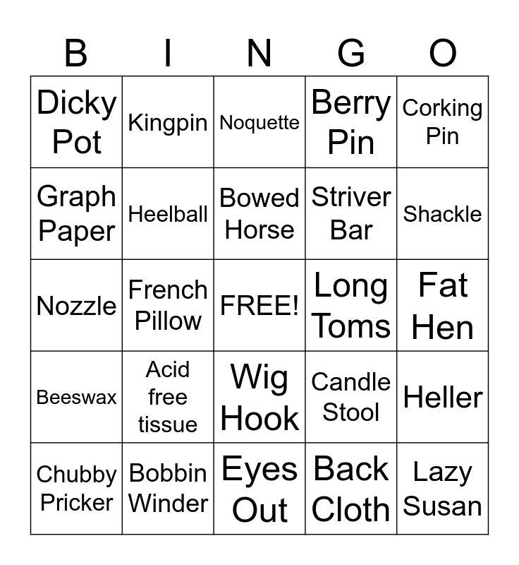 This bingo card has a free space and 24 words: Acid free tissue, Bobbin Winder, Bowed Horse, Chubby Pricker, Corking Pin, Dicky Pot, Graph Paper, Kingpin, Long Toms, Wig Hook, Striver Bar, Nozzle, Candle Stool, Heller, Heelball, Back Cloth, Fat Hen, Noquette, Shackle, French Pillow, Lazy Susan, Beeswax, Berry Pin and Eyes Out.
