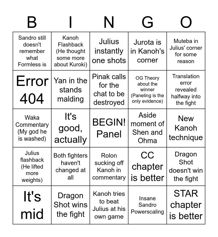 This bingo card has a free space and 24 words: Both fighters haven't changed at all, Dragon Shot wins the fight, Pinak calls for the chat to be destroyed, It's mid, Muteba in Julius' corner for some reason, Sandro still doesn't remember what Formless is, Error 404, Kanoh Flashback (He thought some more about Kuroki), Aside moment of Shen and Ohma, Rolon sucking off Kanoh in commentary, OG Theory about the winner (Paneling is the only evidence), Waka Commentary (My god he is washed), CC chapter is better, Dragon Shot doesn't win the fight, Yan in the stands malding, Insane Sandro Powerscaling, New Kanoh technique, Julius instantly one shots, Translation error revealed halfway into the fight, It's good, actually, STAR chapter is better, Julius flashback (He lifted more weights), Jurota is in Kanoh's corner and Kanoh tries to beat Julius at his own game.