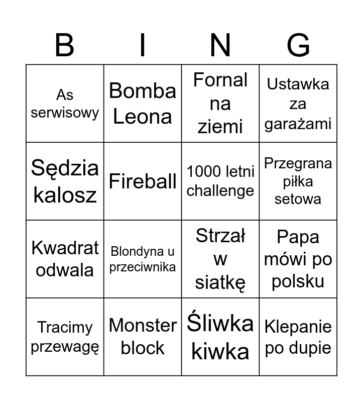 This bingo card has 16 words: Monster block, Papa mówi po polsku, Fornal na ziemi, As serwisowy, Kwadrat odwala, Bomba Leona, Strzał w siatkę, Śliwka kiwka, Sędzia kalosz, Fireball, Tracimy przewagę, Ustawka za garażami, Blondyna u przeciwnika, Przegrana piłka setowa, 1000 letni challenge and Klepanie po dupie.