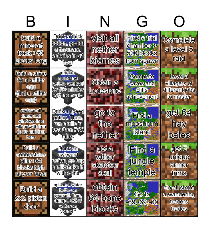 This bingo card has 24 images, a free space and 24 words: Build a 2x2 piston door, Drink an awkward potion, go buy a milkshake irl with coins, Obtain a Lodestone, Go to -69,-69,-69, Complete a level 5 raid, build a minecart track >50 blocks long, Drink a thick potion, go eat a thousand calories in <1 hour, visit all nether biomes, Find a mooshrom island, get 64 hay bales, replace all doors and windows in a village with iron doors and iron bars, drink a mundane potion, workout for 15+ minutes with no music, Find a jungle temple, get 5 unique armor trims, build a shine for a sniffer egg (find a sniffer egg), splash a water bottle on yourself. then, dump 8 OZ of water on yourself, obtain 64 bone blocks, Find a trial chamber > 500 blocks from spawn, Level 3 villagers of different jobs to master, Build a cobblestone pillar >64 blocks high at your base, Drink a speed potion. Then, run a mile in less than 7:30 mins., get a wither skeleton skull, Complete caves and cliffs achievement and do all six of a wandering traders trades.