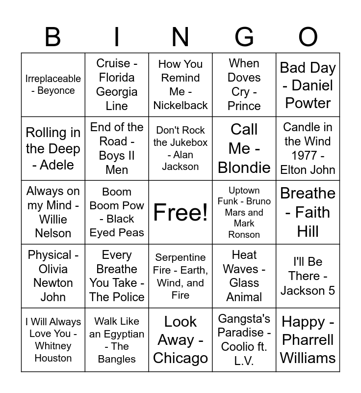 This bingo card has a free space and 24 words: Every Breathe You Take - The Police, Walk Like an Egyptian - The Bangles, Don't Rock the Jukebox - Alan Jackson, I Will Always Love You - Whitney Houston, Bad Day - Daniel Powter, Irreplaceable - Beyonce, Rolling in the Deep - Adele, Cruise - Florida Georgia Line, Uptown Funk - Bruno Mars and Mark Ronson, Serpentine Fire - Earth, Wind, and Fire, Call Me - Blondie, Always on my Mind - Willie Nelson, Heat Waves - Glass Animal, I'll Be There - Jackson 5, End of the Road - Boys II Men, Gangsta's Paradise - Coolio ft. L.V., Breathe - Faith Hill, How You Remind Me - Nickelback, Candle in the Wind 1977 - Elton John, Boom Boom Pow - Black Eyed Peas, Happy - Pharrell Williams, Physical - Olivia Newton John, When Doves Cry - Prince and Look Away - Chicago.