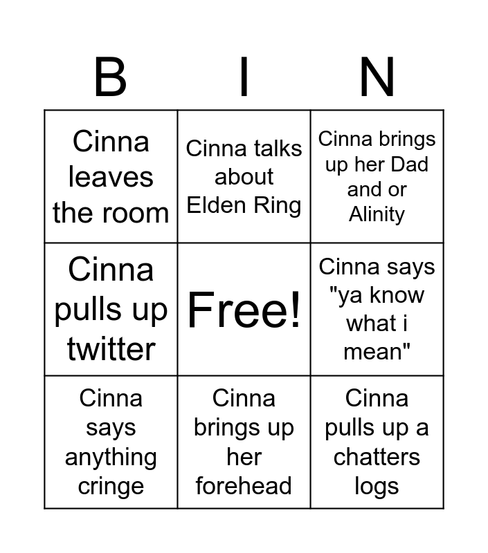 This bingo card has a free space and 8 words: Cinna says "ya know what i mean", Cinna brings up her Dad and or Alinity, Cinna talks about Elden Ring, Cinna says anything cringe, Cinna leaves the room, Cinna pulls up a chatters logs, Cinna pulls up twitter and Cinna brings up her forehead.