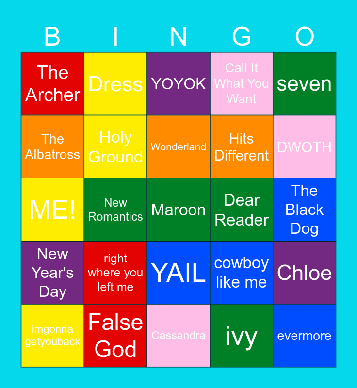 This bingo card has a free space and 24 words: right where you left me, False God, Wonderland, imgonna getyouback, seven, The Archer, The Albatross, Dress, Dear Reader, YAIL, Hits Different, ME!, cowboy like me, Chloe, Holy Ground, ivy, The Black Dog, YOYOK, DWOTH, New Romantics, evermore, New Year's Day, Call It What You Want and Cassandra.