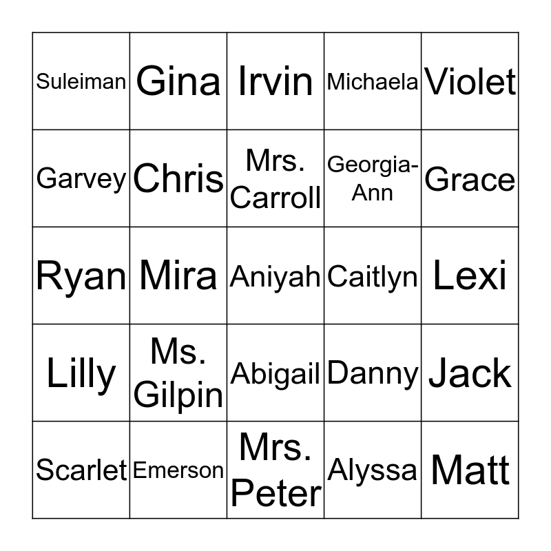 This bingo card has 25 words: Ms. Gilpin, Mrs. Peter, Mrs. Carroll, Scarlet, Violet, Suleiman, Garvey, Gina, Caitlyn, Abigail, Georgia- Ann, Ryan, Danny, Jack, Chris, Matt, Lexi, Irvin, Grace, Mira, Aniyah, Emerson, Lilly, Michaela and Alyssa.