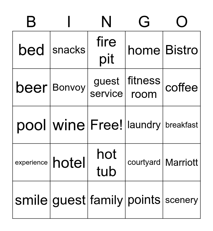 This bingo card has a free space and 24 words: hotel, guest, guest service, smile, Bistro, bed, beer, snacks, laundry, hot tub, fitness room, pool, courtyard, Marriott, Bonvoy, points, breakfast, fire pit, coffee, wine, scenery, experience, home and family.