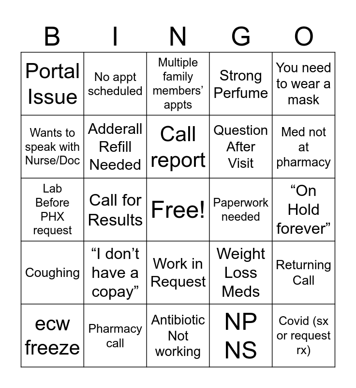 This bingo card has a free space and 24 words: “I don’t have a copay”, Pharmacy call, Call report, ecw freeze, You need to wear a mask, Portal Issue, Wants to speak with Nurse/Doc, No appt scheduled, Paperwork needed, Work in Request, Question After Visit, Lab Before PHX request, Weight Loss Meds, Returning Call, Adderall Refill Needed, NP NS, “On Hold forever”, Multiple family members’ appts, Med not at pharmacy, Call for Results, Covid (sx or request rx), Coughing, Strong Perfume and Antibiotic Not working.