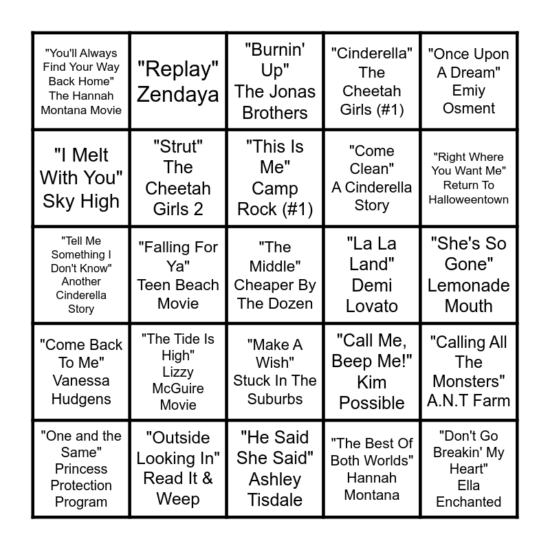 This bingo card has 50 words: "Do You Believe in Magic?" The Game Plan, "The Middle" Cheaper By The Dozen, "Potential Breakup Song" Ally & Aj, "He Said She Said" Ashley Tisdale, "The Tide Is High" Lizzy McGuire Movie, "TTYLXOX" Shake It Up, "Replay" Zendaya, "Achy Breaky Heart" Billy Ray Cyrus, "I Melt With You" Sky High, "Ready Or Not" Brigit Mendler, "Strut" The Cheetah Girls 2, "Cinderella" The Cheetah Girls (#1), "Calling All The Monsters" A.N.T Farm, "Call Me, Beep Me!" Kim Possible, "Push It To The Limit" Jump In!, "Hey Jessie" Jessie, "This Is Me" Camp Rock (#1), "La La Land" Demi Lovato, "Rotten To The Core" The Desendents, "Once Upon A Dream" Emiy Osment, "Falling For Ya" Teen Beach Movie, "The Best Of Both Worlds" Hannah Montana, "You'll Always Find Your Way Back Home" The Hannah Montana Movie, "Come Clean" A Cinderella Story, "Take Me Away" Freaky Friday, "Don't Go Breakin' My Heart" Ella Enchanted, "Right Where You Want Me" Return To Halloweentown, "Drama Queen (That Girl)" Confessions of a Teenage Drama Queen, "Burnin' Up" The Jonas Brothers, "Make A Wish" Stuck In The Suburbs, "Jump To The Rhythm" Jordan Pruitt, "Here I Am" The Suite Life of Zach and Cody (Theme), "Breakaway" Princess Diaries, "Supernova Girl" ZENON, "Outside Looking In" Read It & Weep, "First" Herbie Fully Loaded, "Too Cool" Camp Rock, "Rumors" Lindsay Lohan, "G.N.O" Miley Cyrus, "She's So Gone" Lemonade Mouth, "Unwritten" Ice Princess, "Thats So Raven" That's So Raven (Theme), "I Don't Dance" High School Musical 2, "Bop To The Top" High School Musical, "One and the Same" Princess Protection Program, "Tell Me Something I Don't Know" Another Cinderella Story, "Bet On It" High School Musical 2, "Be a Star 2" Life-Size 2, "Come Back To Me" Vanessa Hudgens and "Wake Up" Hillary Duff.