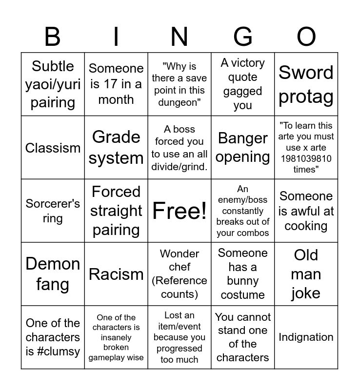 This bingo card has a free space and 24 words: Racism, One of the characters is insanely broken gameplay wise, A boss forced you to use an all divide/grind., One of the characters is #clumsy, Sword protag, Subtle yaoi/yuri pairing, Classism, Someone is 17 in a month, An enemy/boss constantly breaks out of your combos, Wonder chef (Reference counts), Banger opening, Sorcerer's ring, Someone has a bunny costume, Old man joke, Grade system, You cannot stand one of the characters, Someone is awful at cooking, "Why is there a save point in this dungeon", "To learn this arte you must use x arte 1981039810 times", Forced straight pairing, Indignation, Demon fang, A victory quote gagged you and Lost an item/event because you progressed too much.